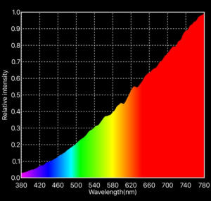 Above: Chart shows the visible light spectrum of an incandescent light bulb at 2650 Kelvin. ASENSETEK Passport Spectrometer used on all spectrum and Kelvin analysis; learn more here.