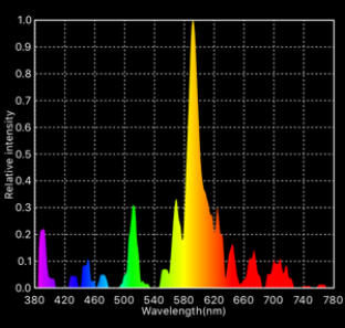 Right: Thomas Edison invented the incandescent light bulb over 130 years ago. This shows a ‘standard light bulb’ with a light spectrum that is similar to a rainbow…with very little blue in the normal visible light spectrum.